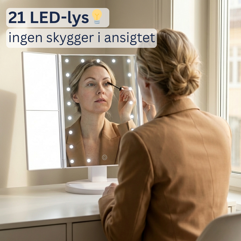 De 21 LED-pærer giver en jævn, naturlig belysning uden skygger i ansigtet. Fra tidlig morgen til sen aften ser du præcis det, du har brug for – og lægger makeup rigtigt første gang.
