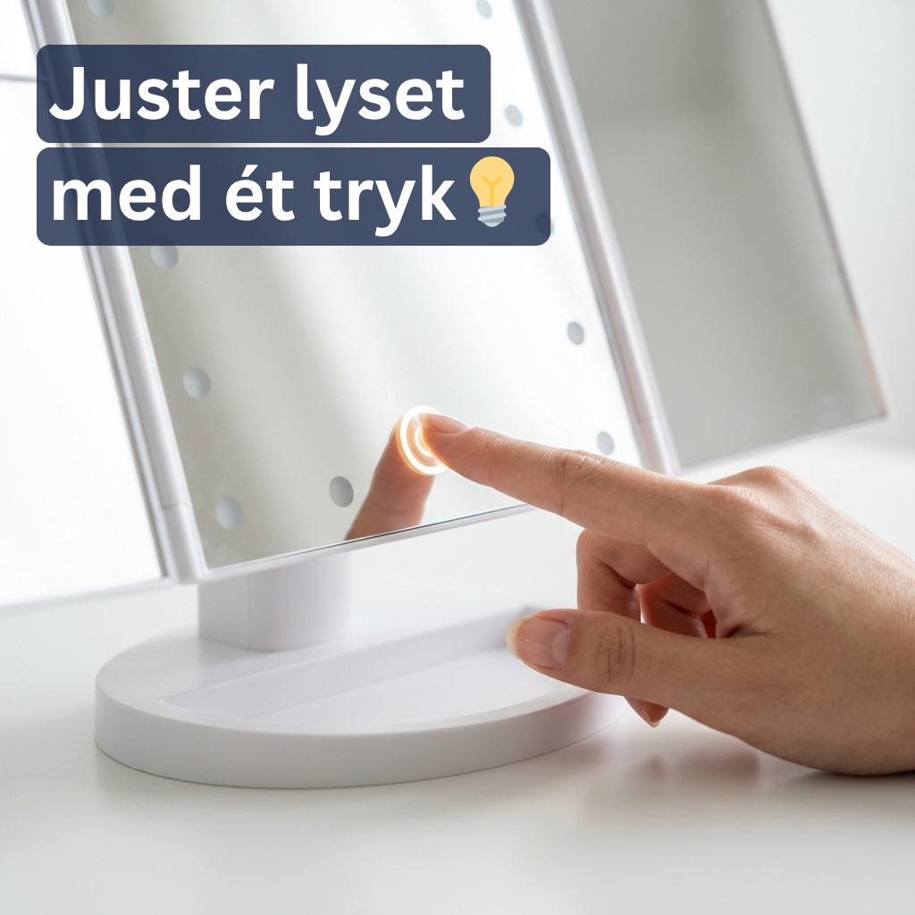 Ja. Hold fingeren på touch-knappen foran for at dimme eller øge lyset — fra blødt morgenlys til fuld lysstyrke. Lyset sidder rundt om hovedpanelet med 21 LED-pærer og giver en jævn belysning uden skygger i ansigtet.