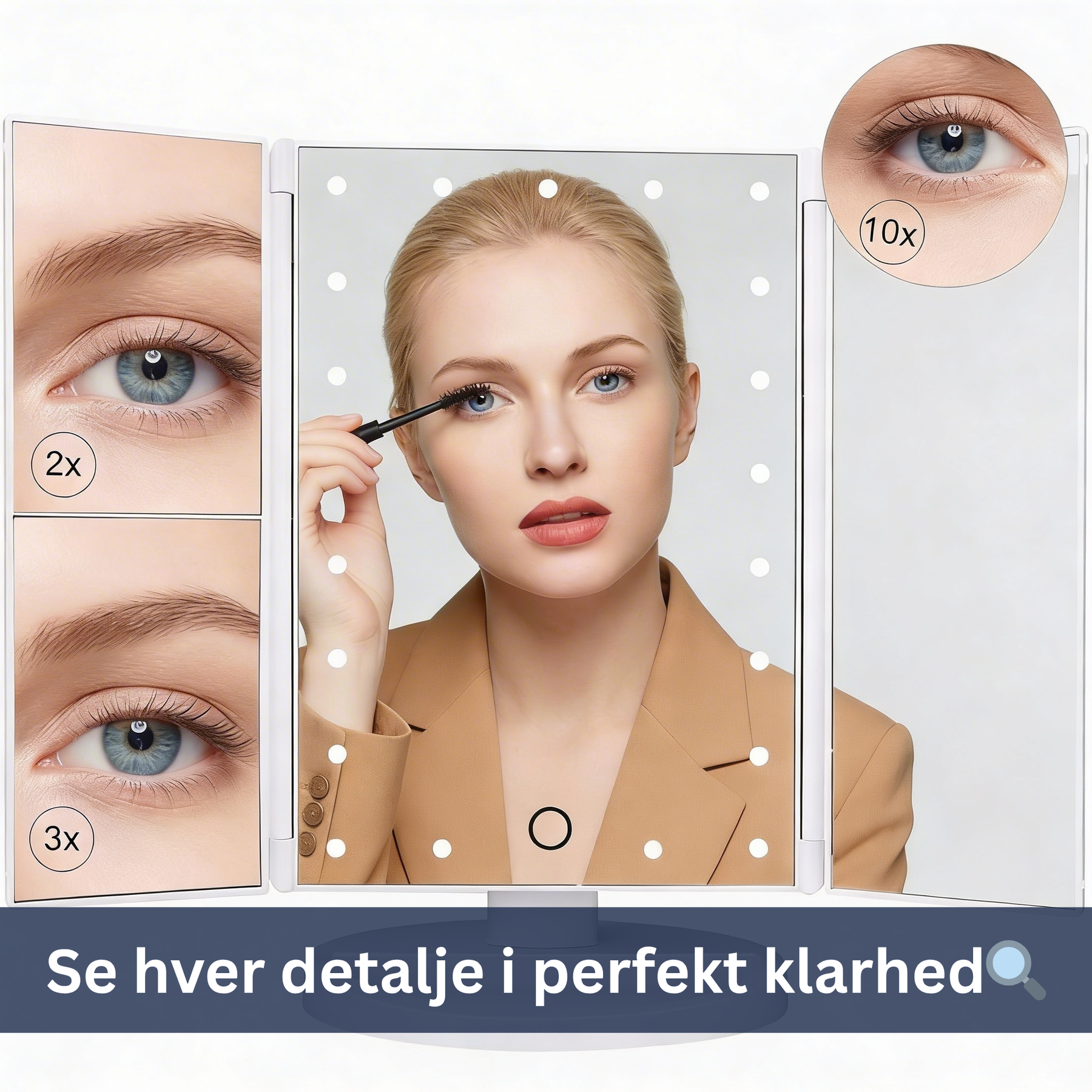 Spejlet har fire forstørrelsesniveauer til forskellige opgaver: 1X på hovedpanelet til det samlede look, 2X og 3X på sidepanelerne til eyeliner og øjenbryn, samt det løse 10X-spejl med sugekop til detaljearbejde som pincet og vipper. Du skifter ikke rundt — alle niveauer er tilgængelige på én gang.
