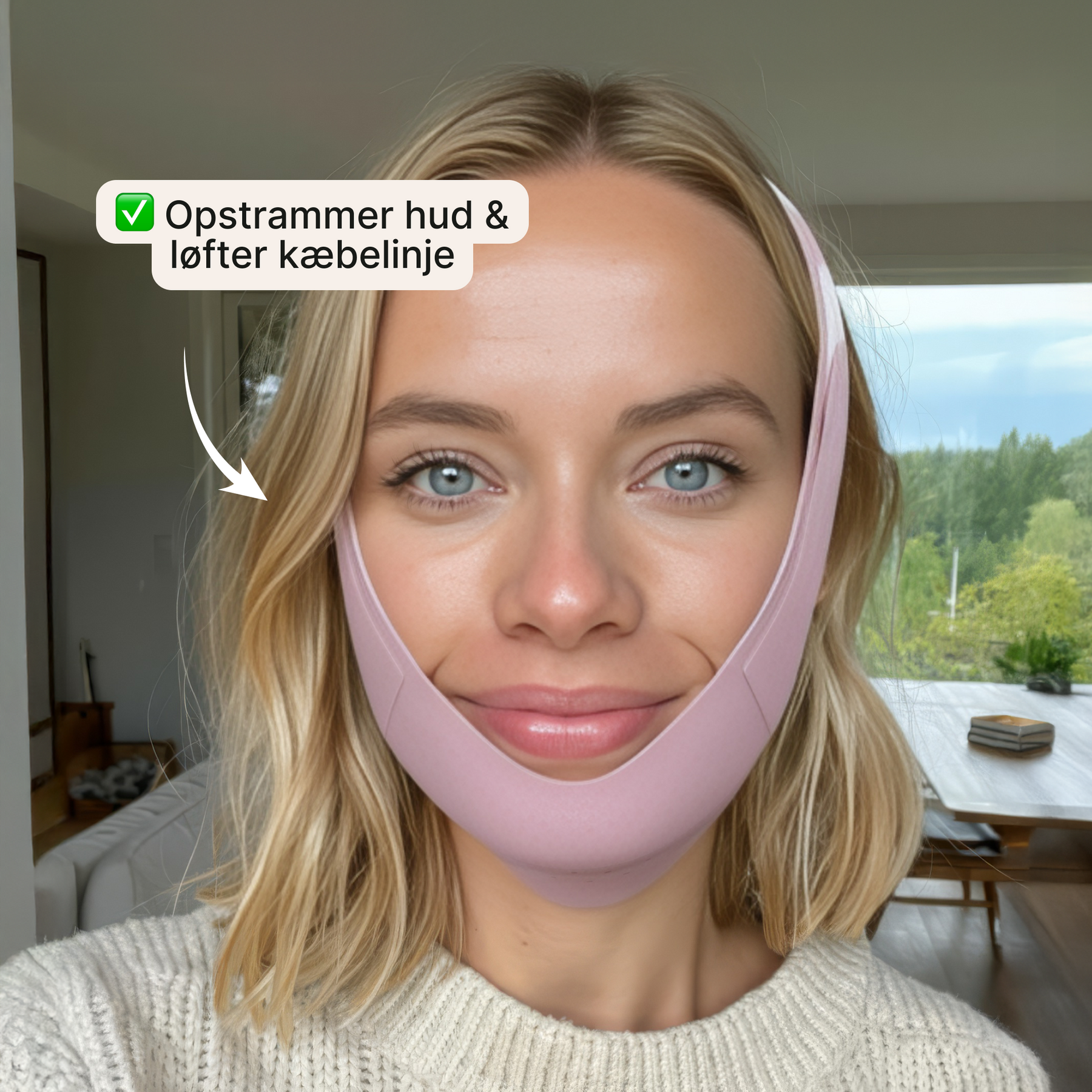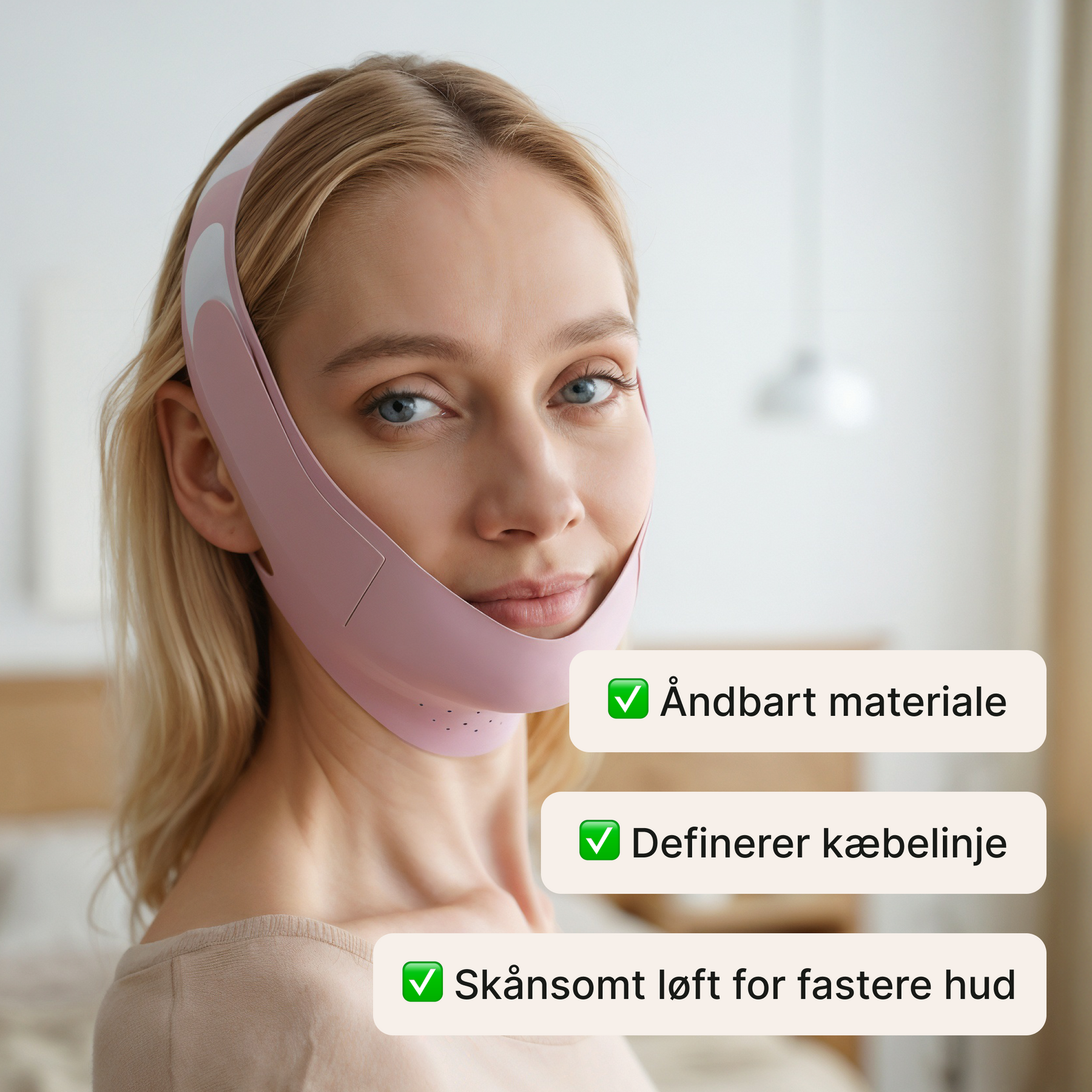 Masken hjælper med at reducere dobbelthage og give et slankere og mere defineret ansigtsudtryk.