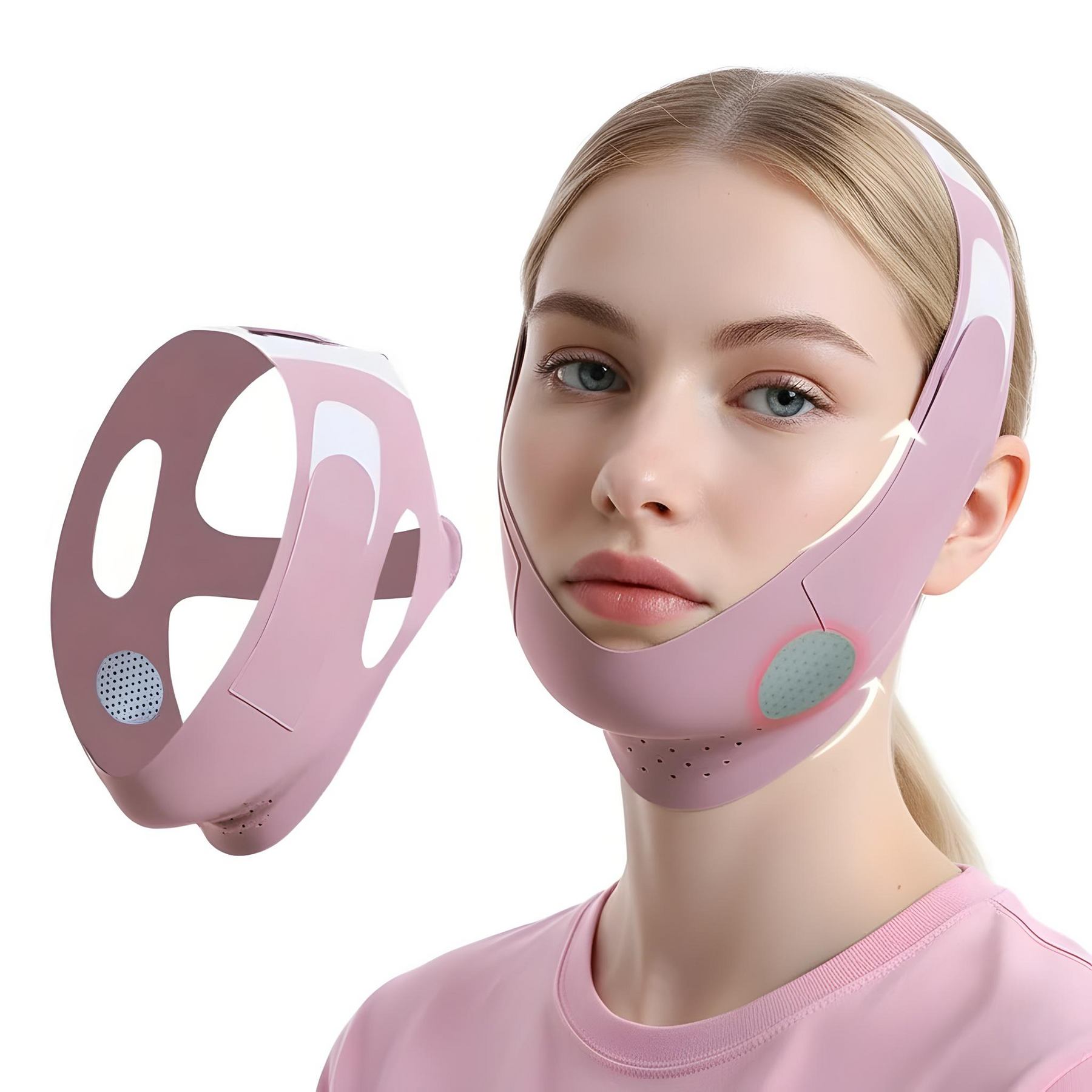Den lette kompression bidrager til at stramme huden op og modvirke slaphed i hage- og kæbeparti.