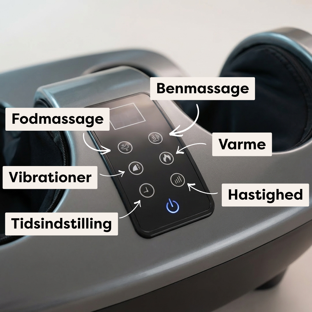 Vi anbefaler at justere fødderne lidt frem eller tilbage i maskinen, så trykpunkterne rammer præcis der hvor du har mest brug for det.