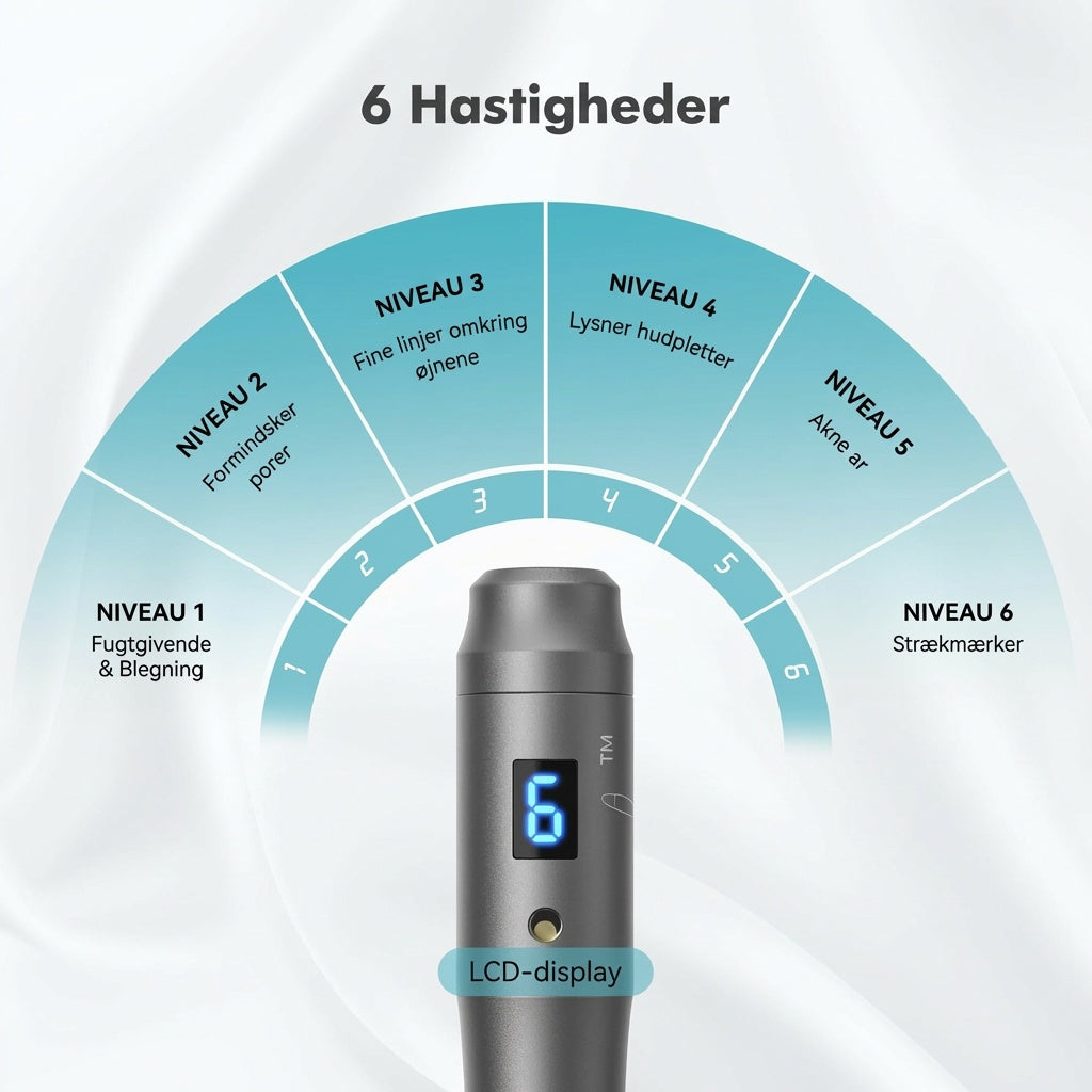 En klinikbehandling koster nemt 1.000–2.000 kr. pr. gang. Vores microneedling pen giver dig samme teknologi i dine egne hænder – med 6 hastigheder, justerbar nåledybde fra 0–2,5 mm og en kraftig motor på op til 16.000 RPM.