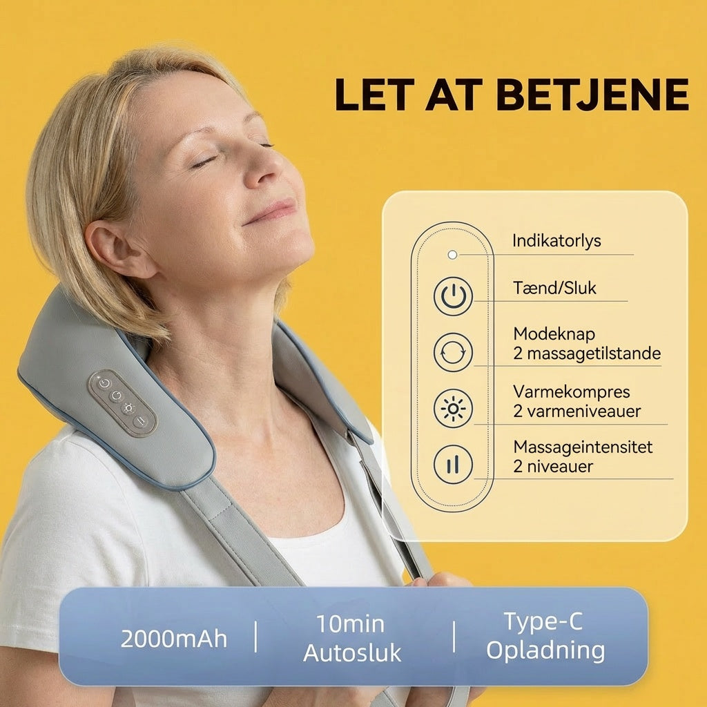 TrapeziusRelief har 6 massagehoveder der efterligner en professionel massørs greb. De 4 øverste hoveder arbejder nakken og skuldrene, mens de 2 nederste presser ned på trapeziusmusklen - præcis som når nogen masserer dig bagfra.