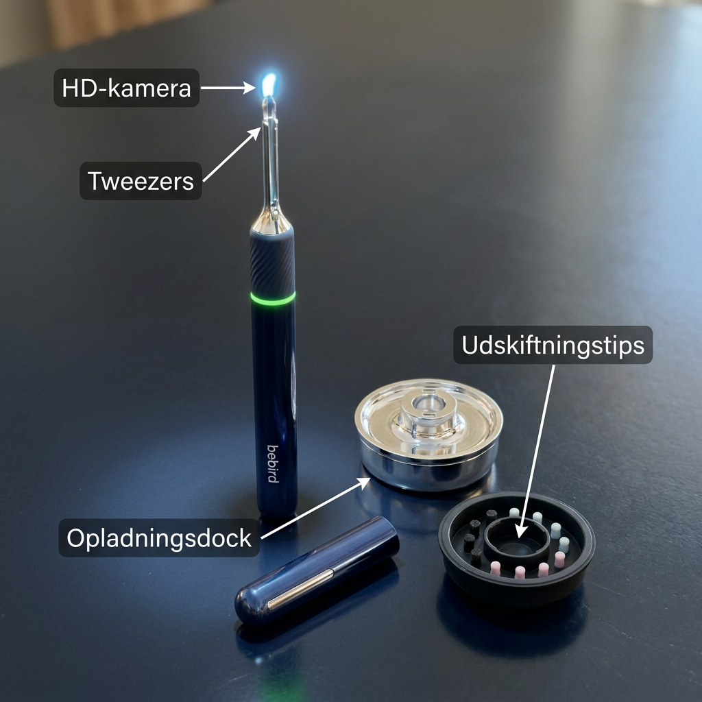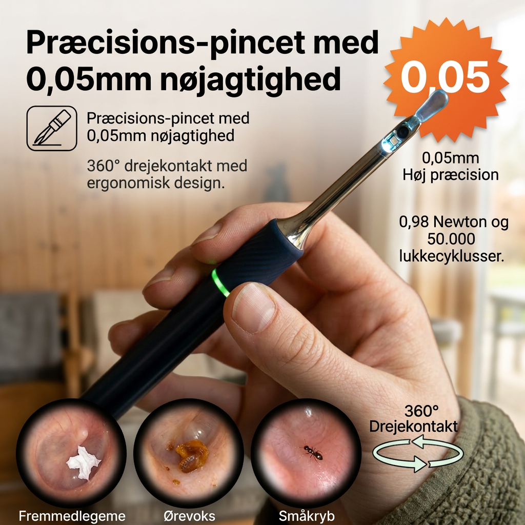 Pincetten lader dig gribe og trække fastsiddende voksklumper ud i ét stykke — i stedet for at skubbe dem længere ind som vatpinde og scoops gør. Det er den funktion kunderne oftest kalder "game changer."