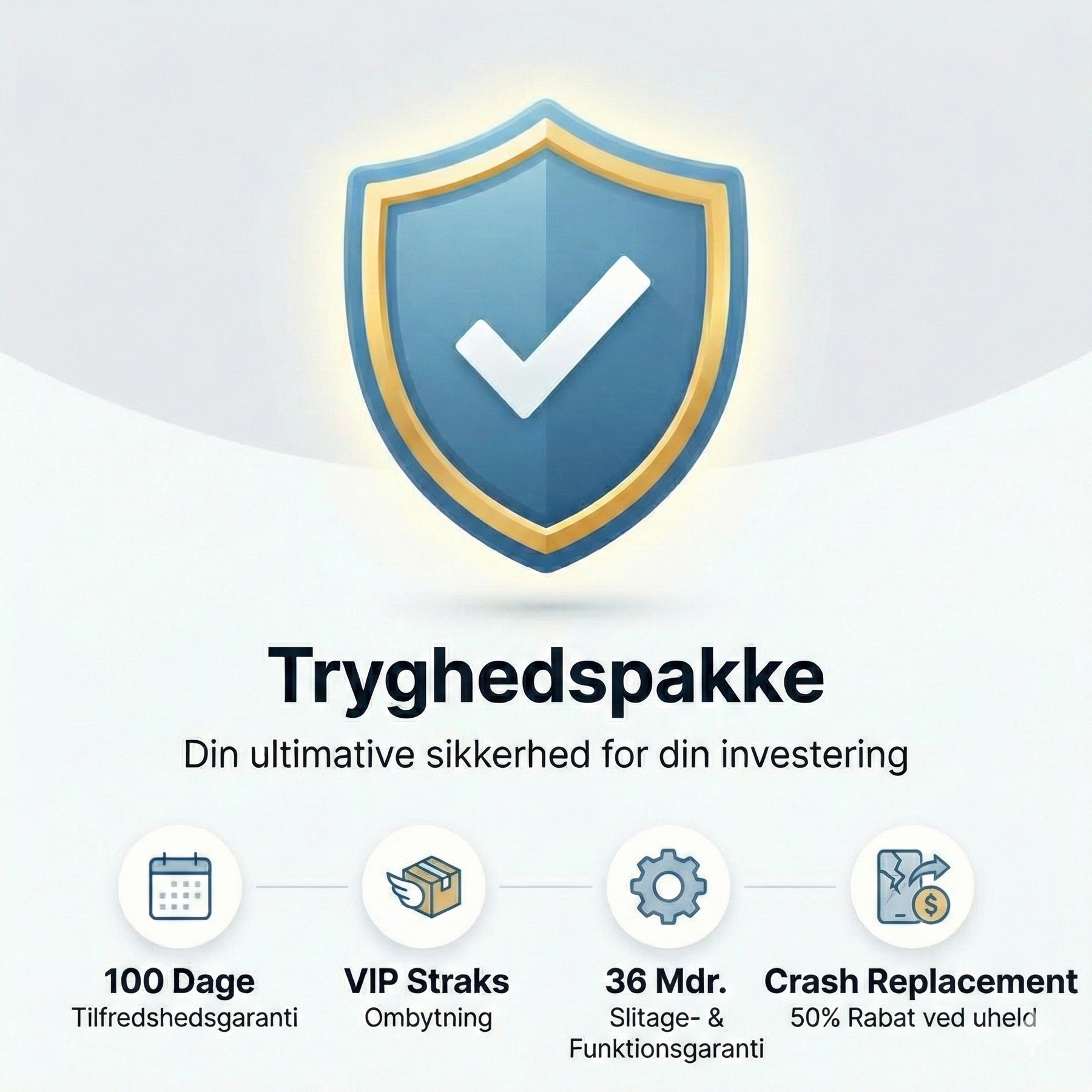 Glem alt om risiko, ventetid og besvær. Når du investerer i kvalitetselektronik, fortjener du tryghed, der rækker ud over lovens standarder. Vores Premium Tryghedspakke er designet til dig, der vil have den ultimative sikkerhed for din investering – uanset hvad der sker.