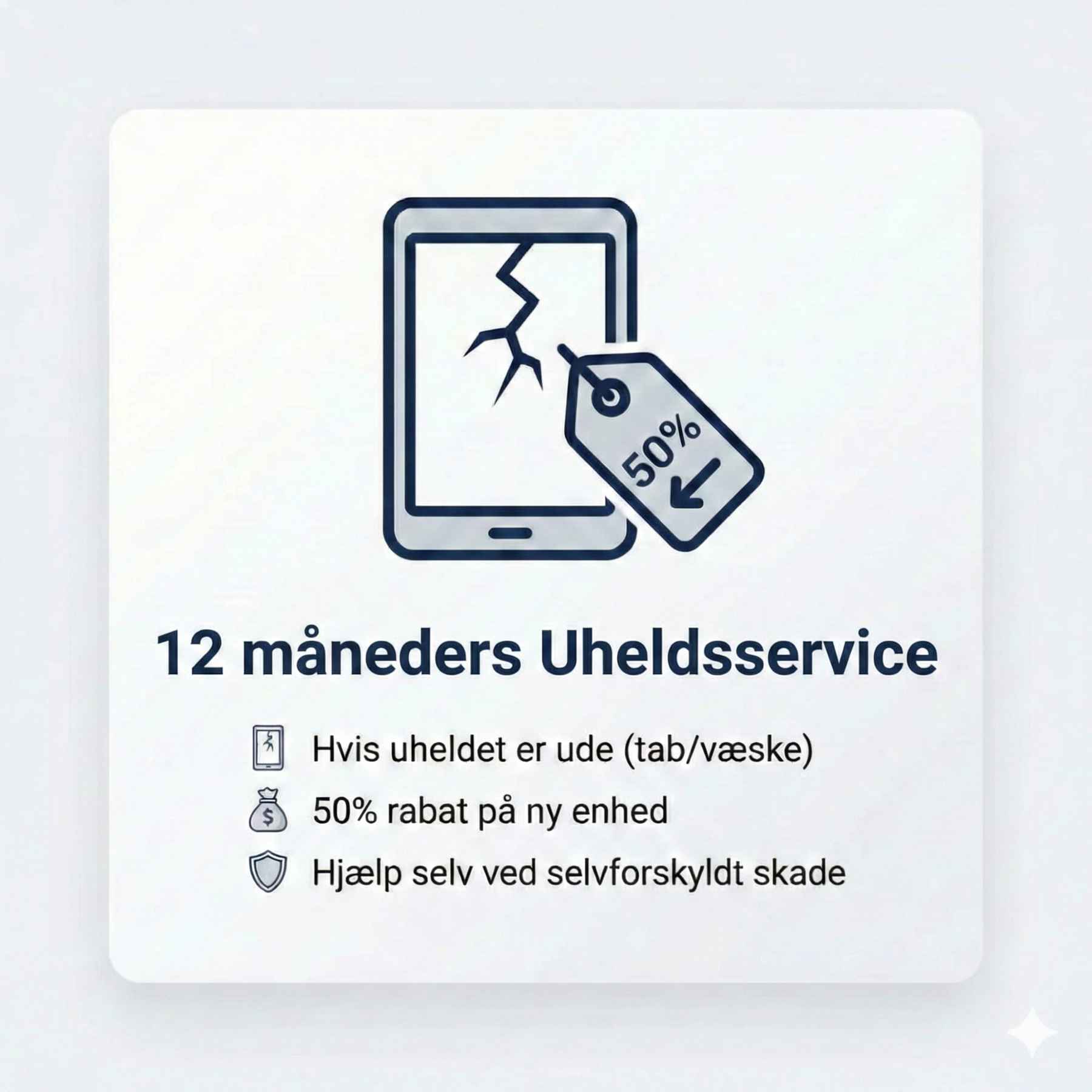 50% Rabat ved uheld: Kommer du selv til at ødelægge produktet (tab, væske el.lign.), garanterer vi, at du kan købe en tilsvarende ny enhed til halv pris af den aktuelle dagspris.