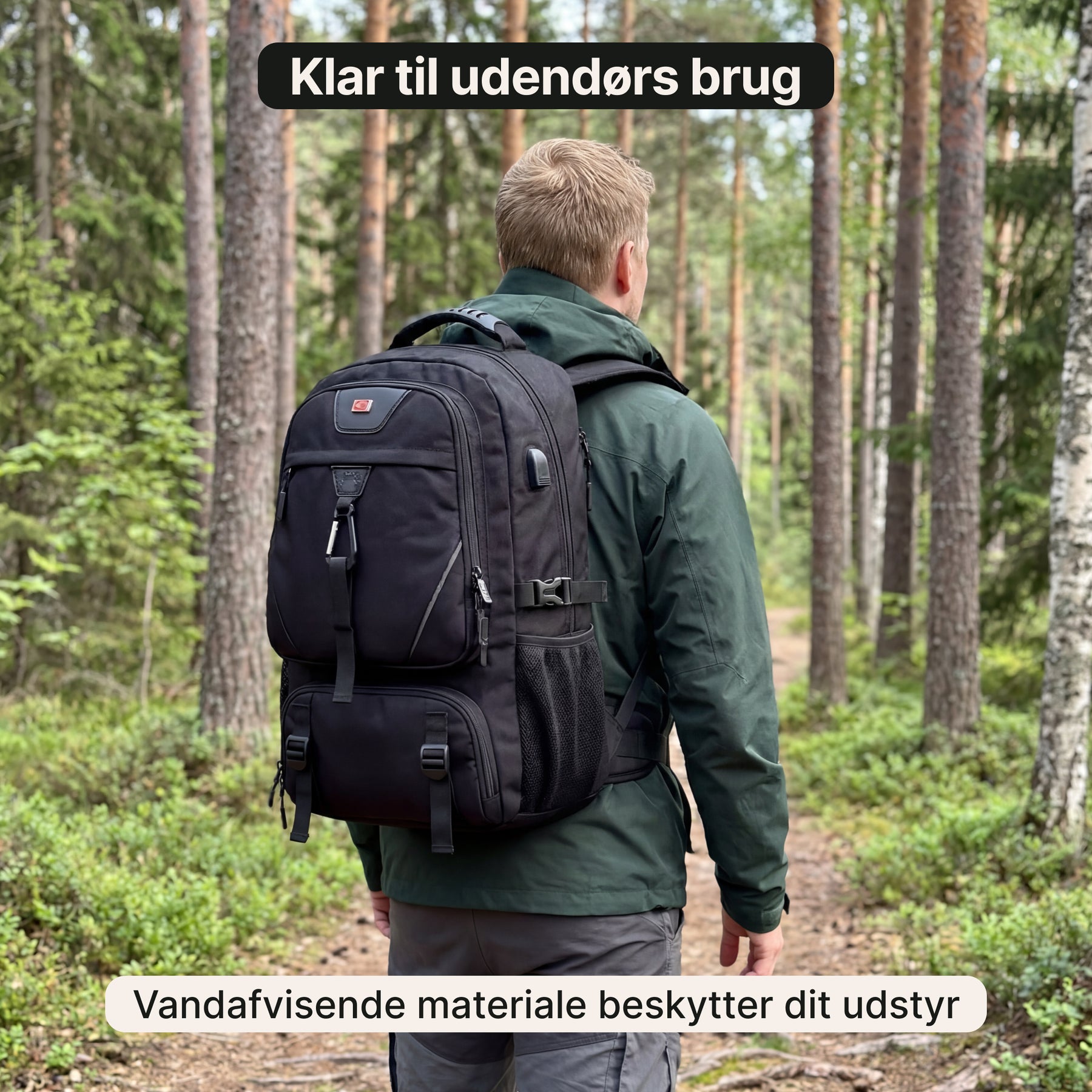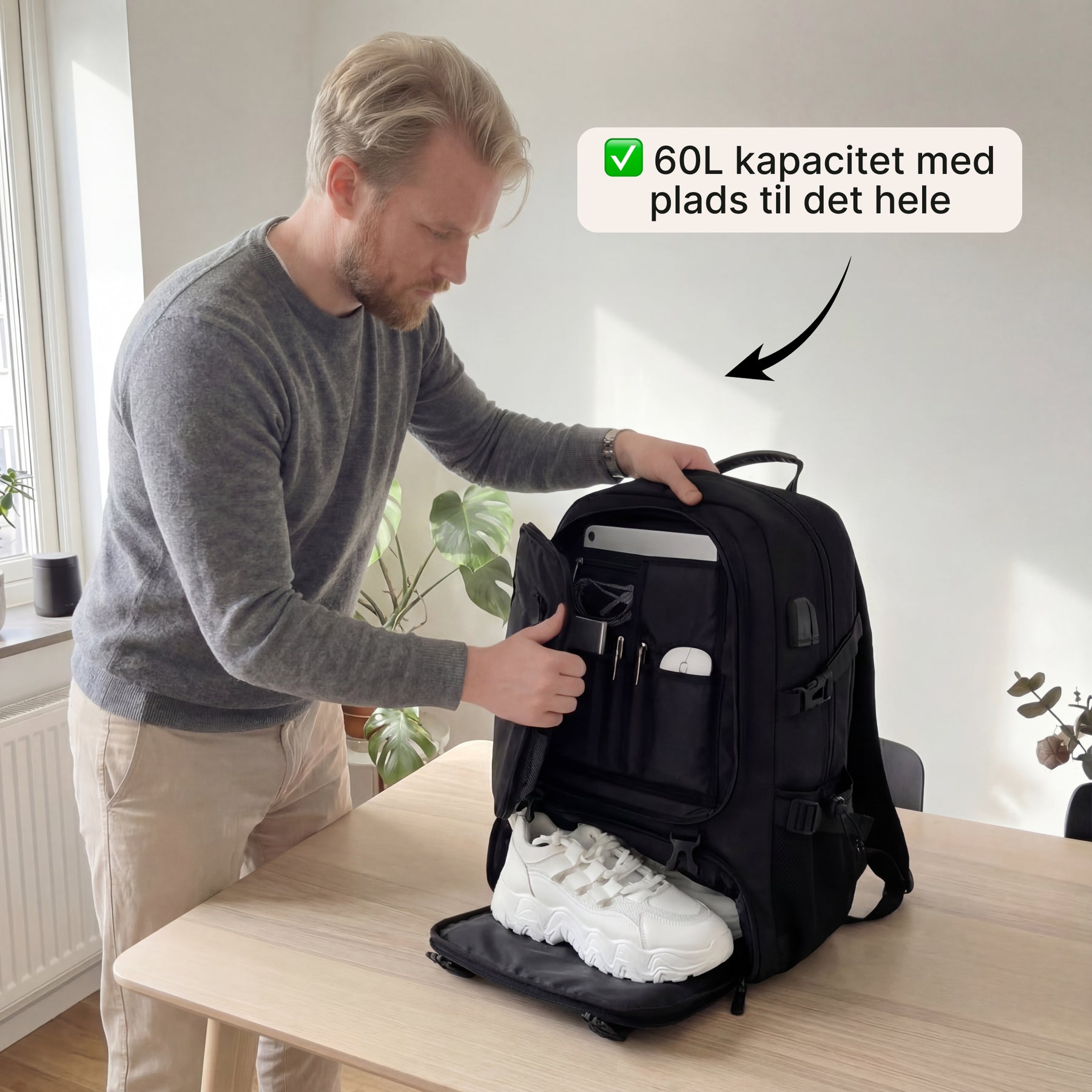 Rygsækken har en kapacitet på op til 60 liter og kan nemt rumme både laptop, tøj og rejseudstyr.