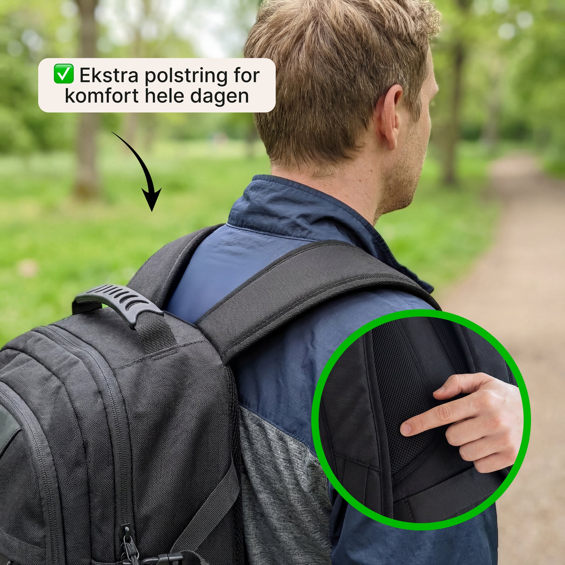 Polstrede stropper og rygpanel sikrer behagelig bæring, selv når tasken er fuldt pakket.